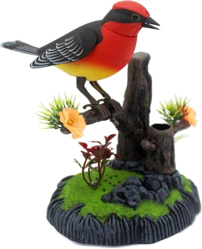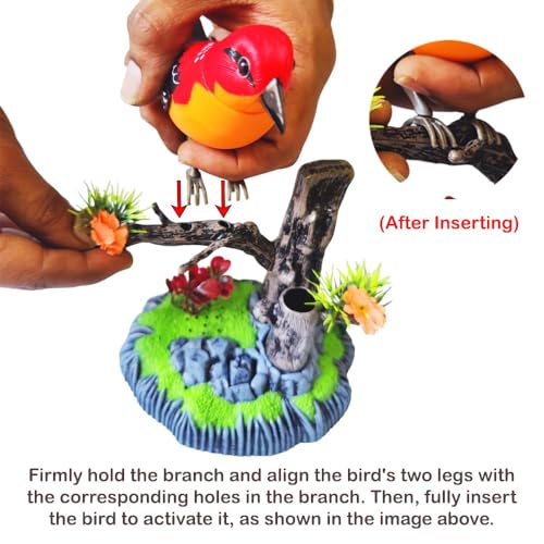 - High simulation: Lifelike bird, high-simulation branches, fine workmanship, just like real bird rest on branches. While the bird is chirping, its heads will swing side to side, the mouth will keep opening and closing, the wings will flap and the body will swing back and forth.