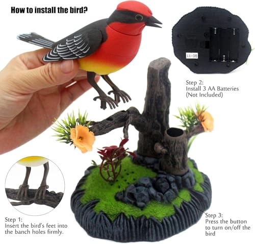 - Operation Guide: Install the bird's feet into the tree branches, put 3 AA batteries in the base, turn on the switch, and the bird will begin to move and chirp.