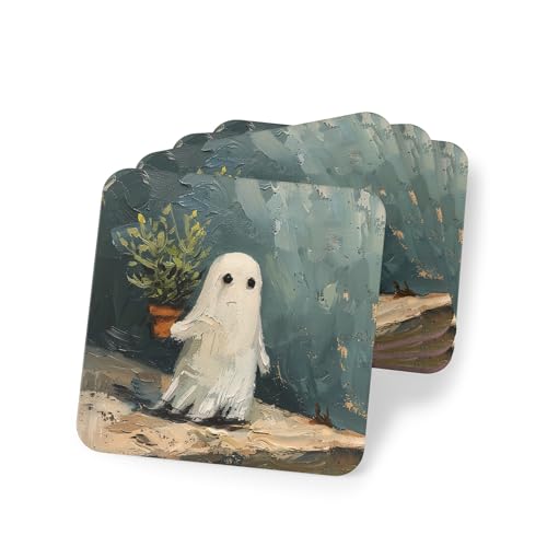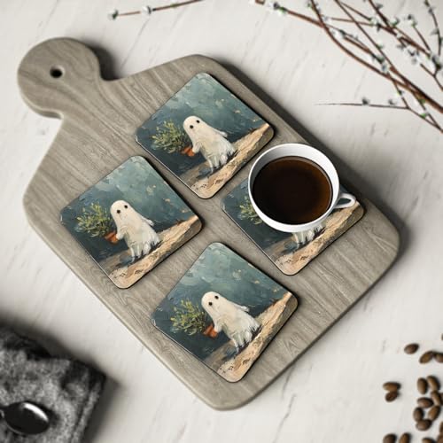 Generic - قواعد أكواب لطيفة على شكل شبح مع نبات - مجموعة قواعد أكواب خشبية بتصميم فني بارز، مناسبة للهالوين - قواعد أكواب خشبية لتزيين الطاولة والمكتب - مجموعة من 4 قطع