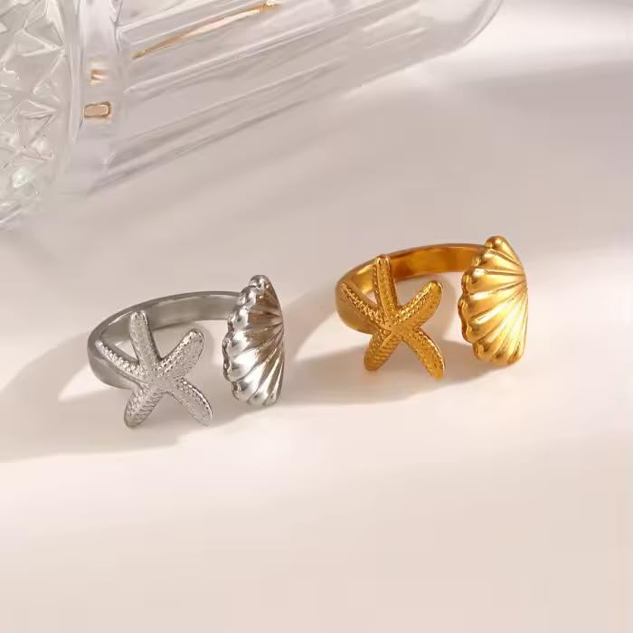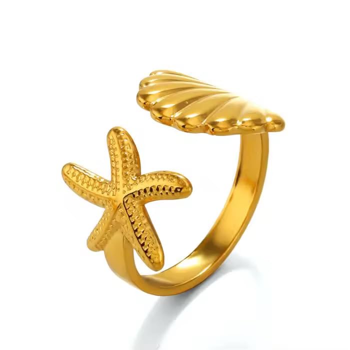 Generic - خاتم لطيف مستوحى من المحيط قابل للتعديل يتميز بتصميم نجم البحر والصدف. مصنوع من الستانلس ستيل المتين مع لمسة نهائية لامعة، مريح للارتداء اليومي. مثالي لمحبي الشاطئ