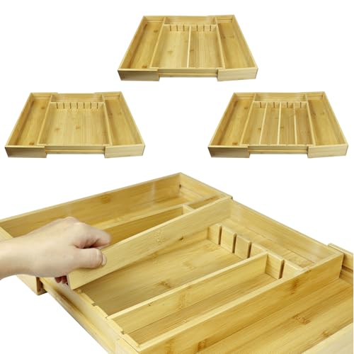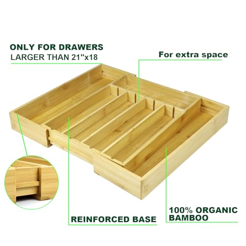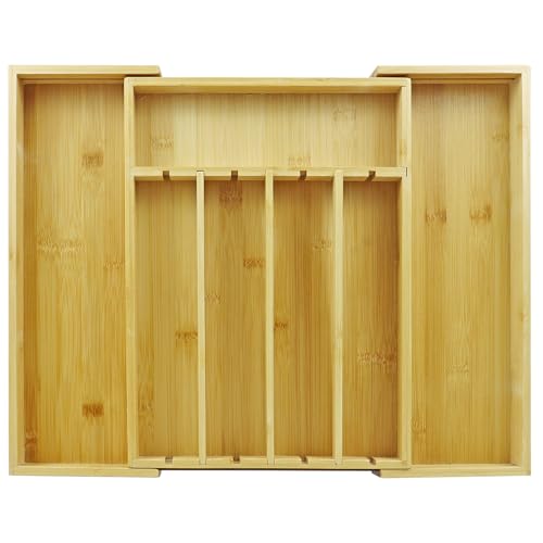 cutesun - منظم ادراج مطبخ قابل للتعديل من 5 الى 7 فتحات لاواني الطبخ الكبيرة وادوات المائدة، صينية تنظيم ادراج المطبخ من الخيزران مع فواصل ادراج لادوات المطبخ من كيوتسن (5-7 فتحات)
