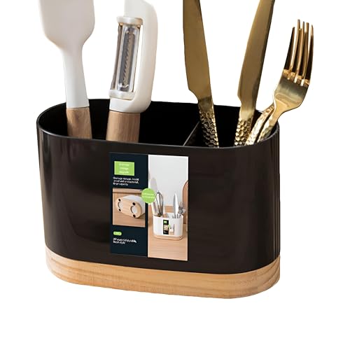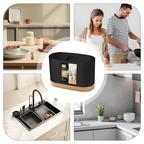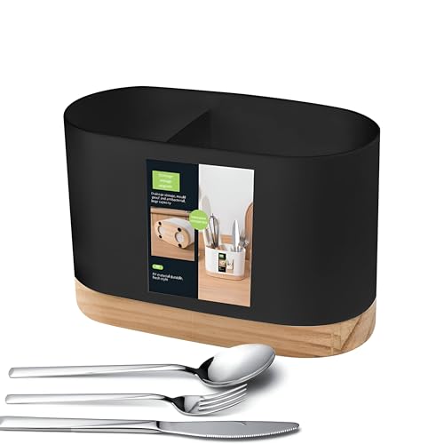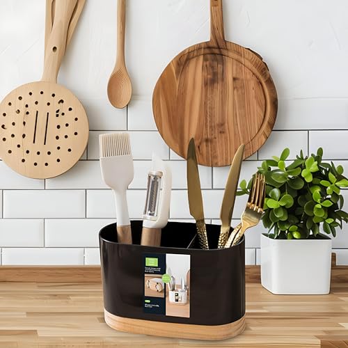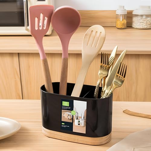 - راحة تدوم طويلًا: حامل أدوات الطعام هذا مصنوع من بلاستيك مقاوم للتآكل وقاعدة خشب متينة وموثوقة. مصمم ليدوم طويلًا ويوفر حلًا متينًا لتخزين أدوات المطبخ.