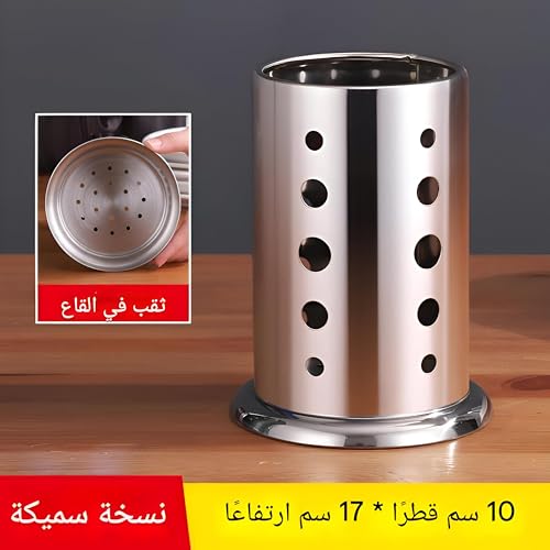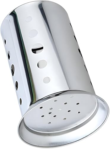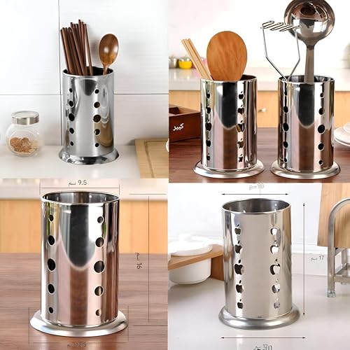 - This stainless steel utensil holder features a modern circular design with strategic ventilation holes, enhancing both airflow and aesthetic appeal, making it an elegant addition to any contemporary kitchen setup. Its durable structure ensures long-lasting performance and stability on countertops, effectively organizing various kitchen tools and cutlery while giving your space a sleek, professional look.