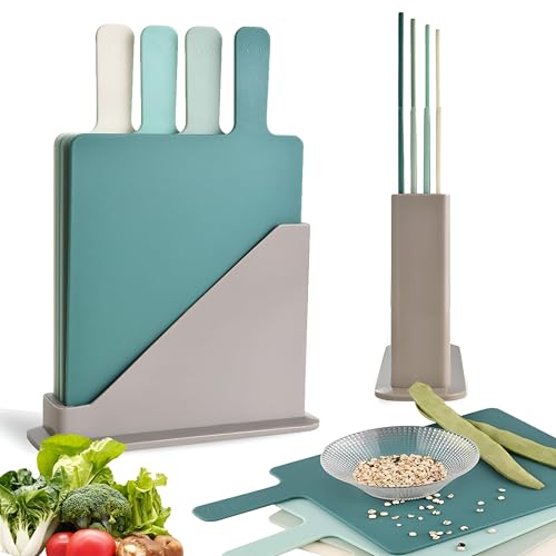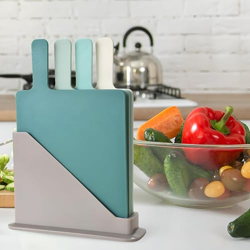 - مجموعة ألواح تقطيع بلاستيكية من أربع قطع مع حامل عملي؛ الألواح مرمزة بالألوان لتحديد الاستخدامات بسرعة: الفواكه والخضروات والخبز والأطعمة الأخرى.