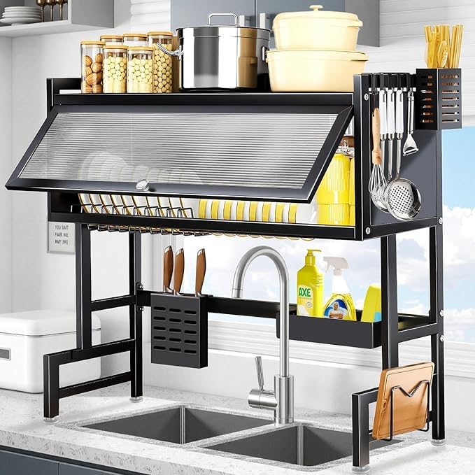 - 🍋{More effective dust and moisture}The 3 Tier Over The Sink Dustproof Drain Dish Drying Rack is equipped with transparent cabinet doors made of PC material, and its six integral thickened sealing plates are effective against moisture. It prevents dust from entering the cabinet 360 degrees. It can hover after you open the cabinet door for better access, and it has a door handle that allows you to open it easily, making it easier for us to open the door.