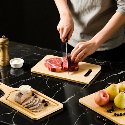 - 【Natural Bamboo – Durable】: Crafted from 100% organic bamboo, these wooden kitchen boards are strong, smooth, and gentle on knives and easy to clean . A sustainable, long-lasting alternative to plastic cutting boards – perfect for slicing meat, vegetables, cheese, bread, and fruit.
