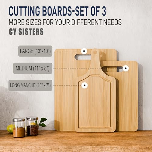 CY SISTERS - Bamboo Cutting Board Set of 3 Natural Wooden Chopping Boards with Handles for Kitchen, Charcuterie & Cheese Serving Trays, Rustic Food Prep Platters for Bread, Meat, Fruit & Decor Display