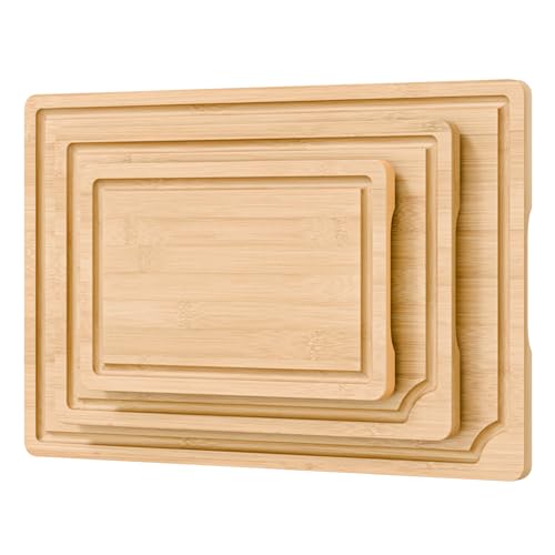 - 【Premium Bamboo – Durable, Eco-Friendly, Knife-Friendly】: This kitchen cutting board set crafted from 100% natural bamboo wood, is sustainable, It’s tougher than plastic but gentle on knives, making it a long-lasting choice for food prep, cooking, and serving.
