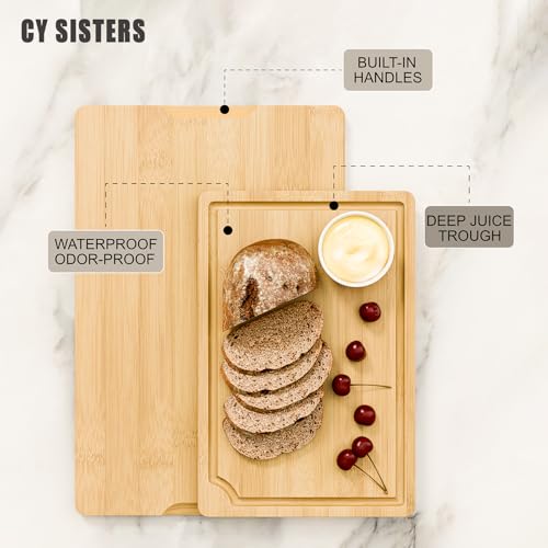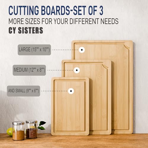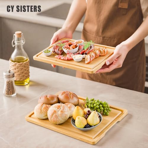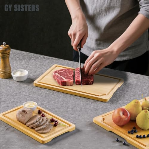 CY SISTERS - Bamboo Cutting Board Set of 3 Wooden Kitchen Chopping Boards with Juice Grooves & Handles, Charcuterie Cheese Serving Trays Food Prep Platters for Meat, Vegetables & Display