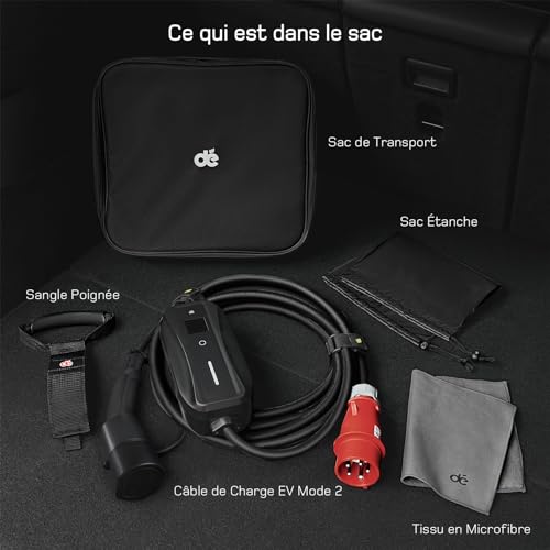 - Package includes: 11 kW charging station EV charging cable, waterproof bag, carrying strap, microfibre cloth and Schuko adapter included. A splash-proof bag to store your cable in the trunk. Compact and foldable design saves space and prevents it from being thrown around in the truck. A carrying strap for cable management, taking with you or hanging on the wall. A cleaning cloth in the case and a waterproof bag for use in the rain.