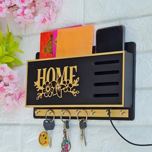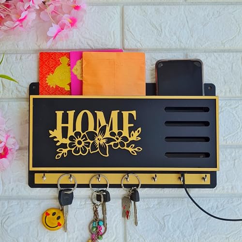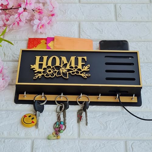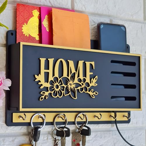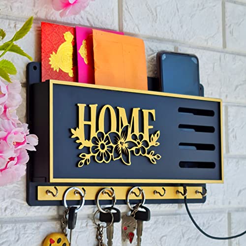 D Unique Home Decor - Unique Stylish Attractive Wooden Key Holder for Wall Decor with Stylish Stainless Steel 7 Hooks Beautiful Key Hanger Home for Decor (Black Golden)