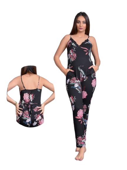 Dadoush - Dadosh Women's Floral Print Modern Design Suspenders & Pockets Jumpsuit - Elegant Black