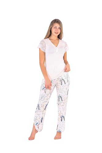 Shower - طقم بيجامة حريمي صيفي من دعدوش باكمام نصفية مطرزة بالدانتيل , بيجاما حريمي صيفي قطعتين بتصميم انيق وجذاب .