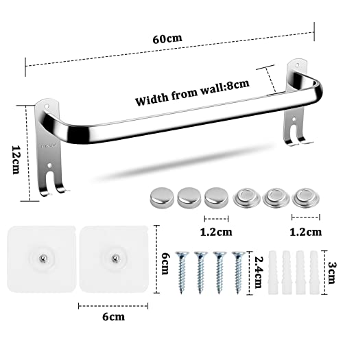 Daelesr - Silver Towel Holder Bathroom, Sticker or Wall Towel Rail Wall Mounted Bars with Hooks, Stainless Steel Towel Holder for Bathroom Shower Kitchen (60 CM)