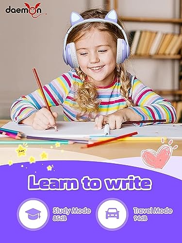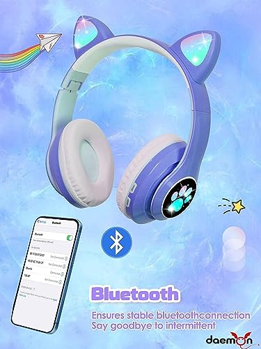 Daemon - سماعات رأس بلوتوث لاسلكية للأطفال، بنمط أذن قطة بإضاءة ليد، سماعة ستيريو قابلة للطي توضع فوق الأذن بميكروفون/بطاقة TF للايفون/اي باد/الموبايل السمارت/اللاب توب/الكمبيوتر/التلفزيون، (بنفسجي)