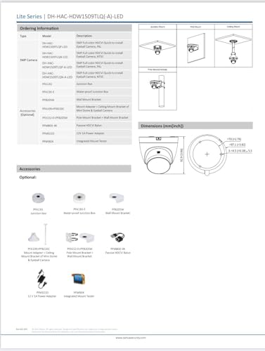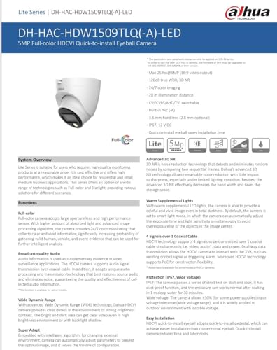 DAHUA - Dahua 5MP Full-color HDCVI Quick-to-install Eyeball Camera DH-HAC-HDW1509CLQP-A-LED Compatible with J.K.Vision BNC DC