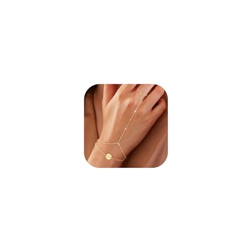 CHESKY - Dainty Gold Hand Chain Bracelet for Women Trendy –14k Gold Plated Minimalist Finger Ring Bracelet Charm with Personalized A-Z Initial Disc, Adjustable Layered Chain Non Tarnish Jewelry Gift for Her