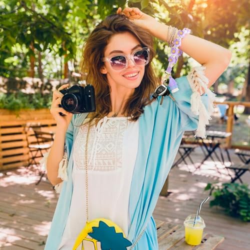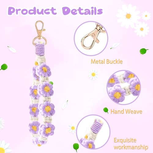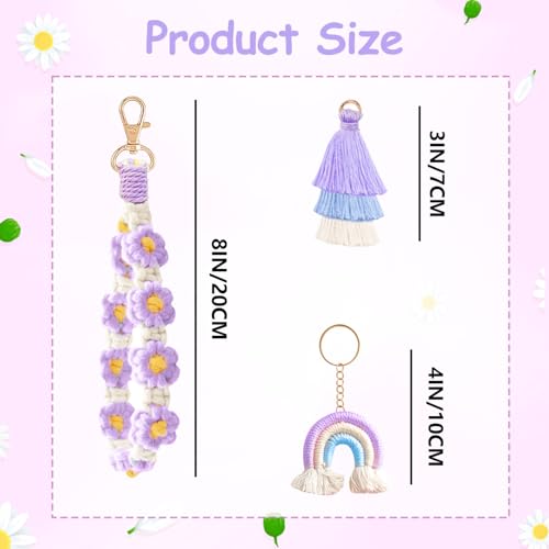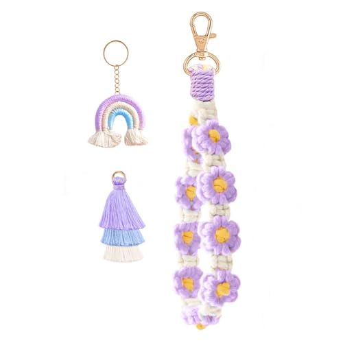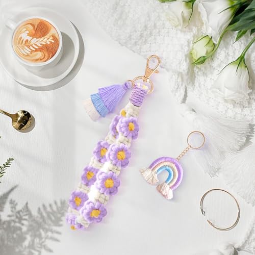 Fruitful Jewelry - Daisy Boho Handmade Wristlet,3 in 1 Boho Daisy Flower Wristlet Keyring, Daisy Boho Handmade Wristlet Macrame Keychain Wristlet with Boho Rainbow Boho Pom Pom Tassel Boho Keychain Bracelet Holder