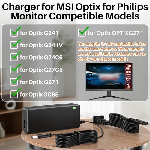 - Compatibility-- The DC 20V power cord for MSI Monitor Optix G241 G241V G24C6 G27C5 G271 ADPC2045 3CB5 OPTIXG271 curved FHD freesync gaming monitor 20V DC 2.25A power cable battery charger mains PSU replacement cord. For MSI Optix G24C4 monitor; for MSI Optix G32 Series monitor; for MSI Optix G27C4 Model 3CA9 monitor; for MSI gaming monitor Optix G27C4W/G27C4 monitor power cord