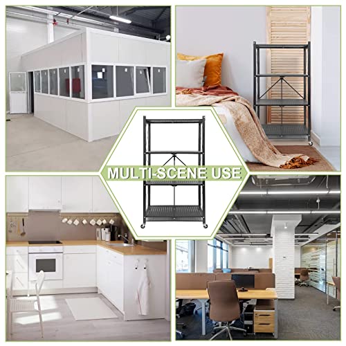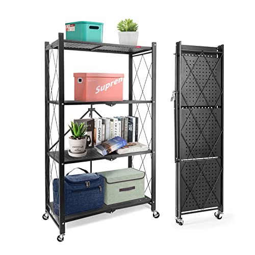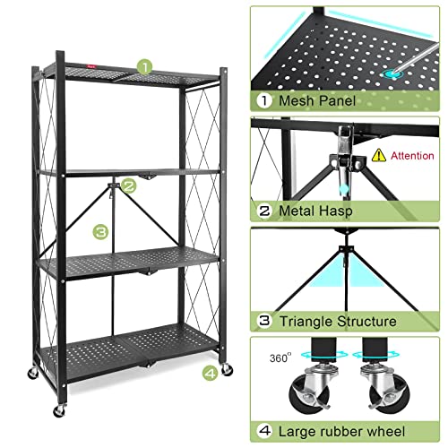 DEANIC - DEANIC 4-Shelf Foldable Storage Shelves with Wheels, Large Capacity Shelving Unit, Freestanding Metal Wire Shelf Rack, No Assembly Organizer Rack for Garage Kitchen