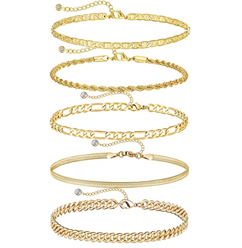 DEARMAY - DEARMAY Waterproof Gold Ankle Bracelets for Women - Dainty 6Pcs 14K Gold Plated Anklets Layered Cuban Link Chain Herringbone Cute Anklets Set Pack Summer Beach Jewelry Gift for Women Teen