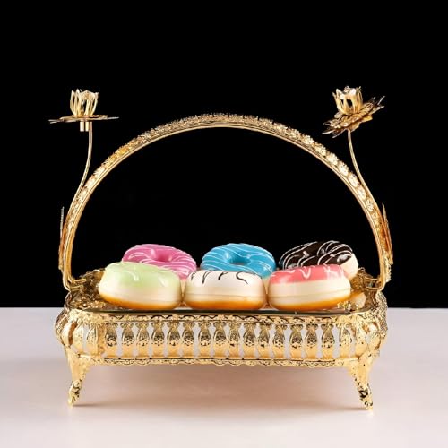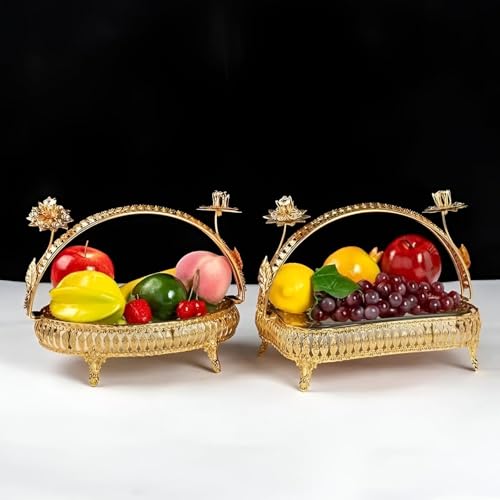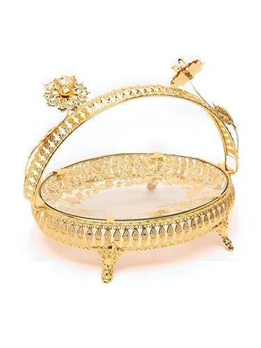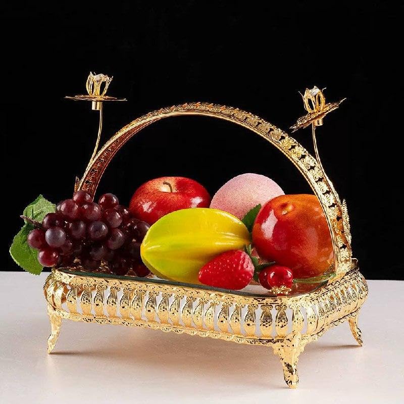 - This serving plate and fruit holder brings together a golden metallic shine and a sleek glass base, creating a luxurious blend of elegance and durability, making it a remarkable centerpiece for any occasion.