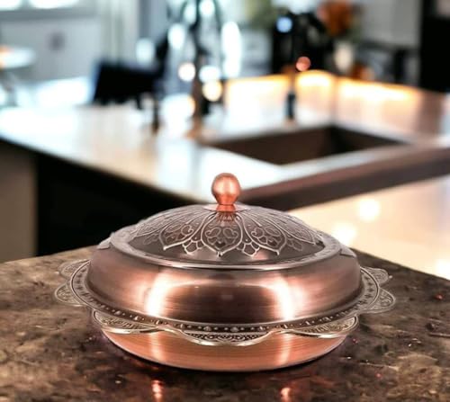 - AUTHENTIC DESIGN: Exquisitely crafted copper serving tray featuring intricate traditional Arabic patterns and detailed ornamental engravings on both lid and base