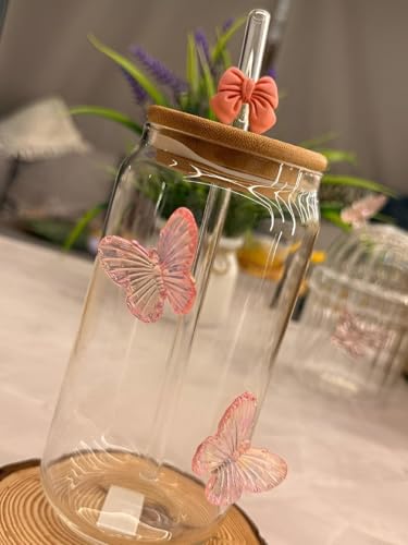 Generic - Decorative Cup - Pink Butterfly Glass with Lid and Straw, 550ml 3D Floral Butterfly Pattern, Featuring Bow for Cozy and Charming Drink Moments