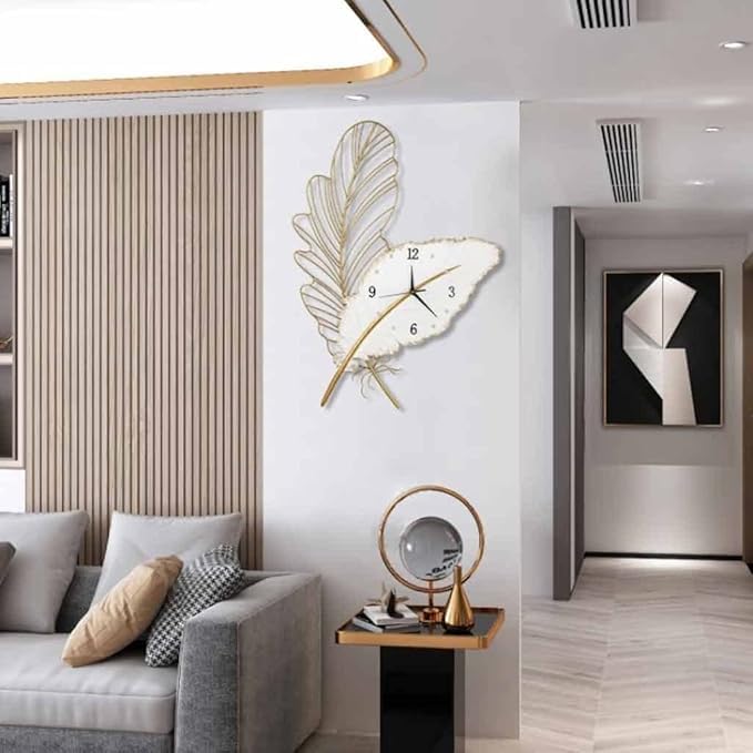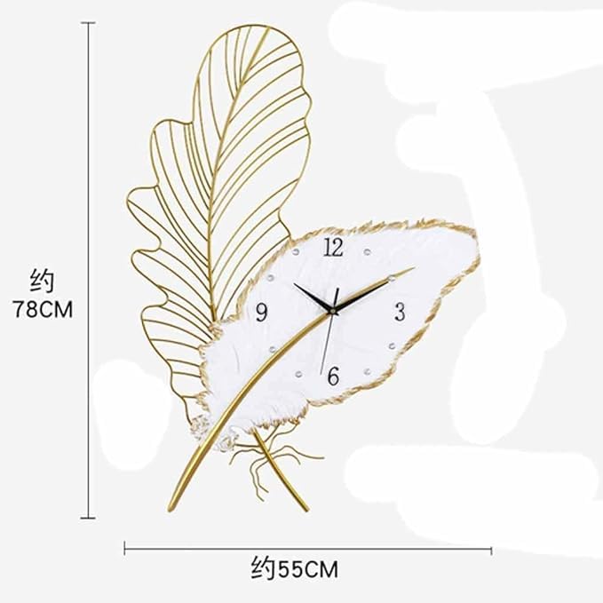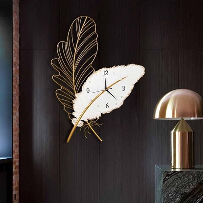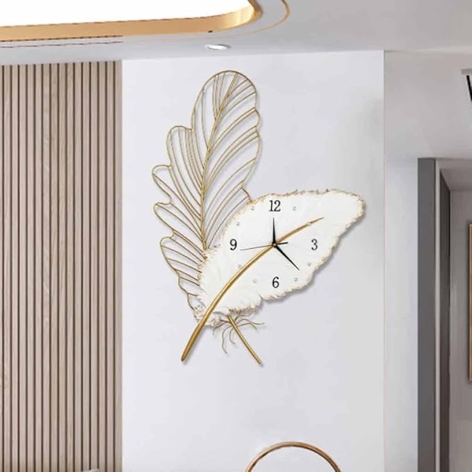 - تصميم أنيق: ساعة حائط جميلة على شكل ريشة تتميز بتصميم أوراق ذهبية متطورة مع خلفية بيضاء، مثالية لديكور المنزل العصري