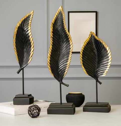 Generic - Decorative Gold Leaf Sculptures, Set of 3, Metal Standing Art Pieces with Black Base, Modern Home Decor (black)
