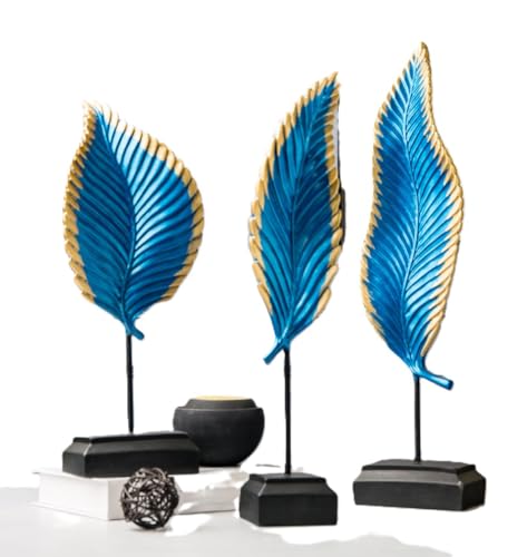 Generic - منحوتات ورقية ذهبية مزخرفة، مجموعة من 3 قطع، قطع فنية معدنية قائمة مع قاعدة سوداء، ديكور منزلي عصري (ازرق)