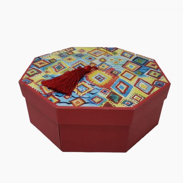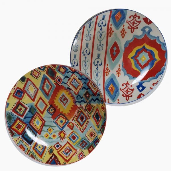 - نمط فني: تصميمان متميزان يتناولان بين الأطباق - أحدهما يتميز بأشكال هندسية ماسية والآخر يعرض زخارف حلزونية أنيقة باللون الأحمر والأزرق والأصفر