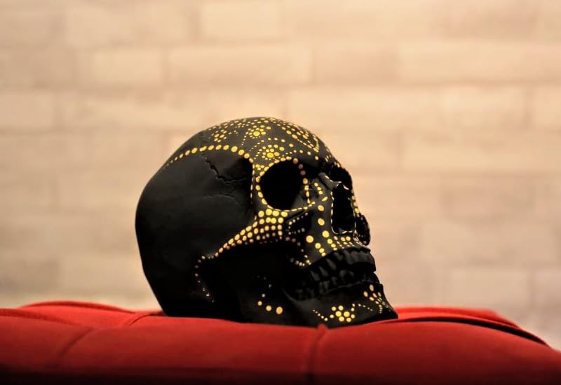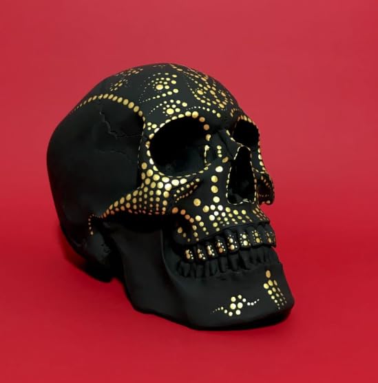 - DESIGN: Matte black skull sculpture adorned with intricate golden dot patterns, creating a striking contrast and elegant aesthetic appeal