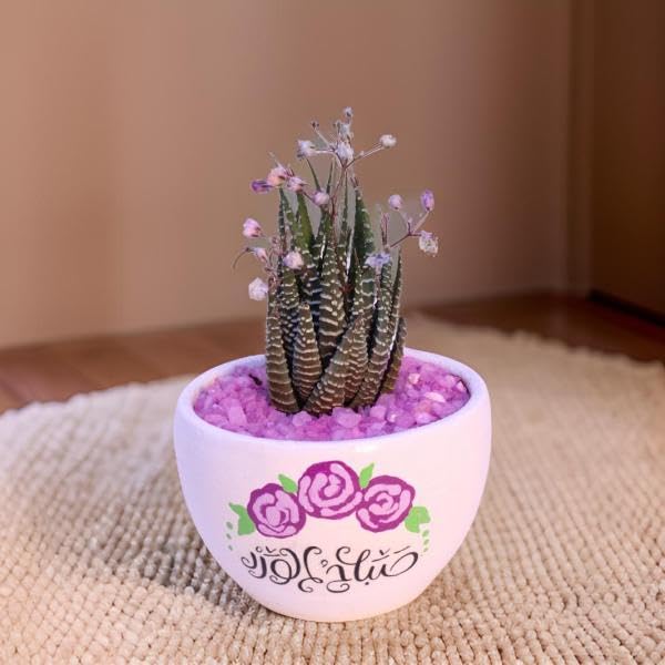 - تصميم زخرفي: أصيص سيراميك ساحر يتميز بورود أرجوانية مرسومة يدويًا وحروف فنية على قاعدة بيضاء