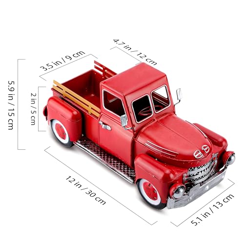 - Timeless vintage red truck design adds farmhouse charm and a nostalgic vibe to any room, serving as a stylish tabletop decor piece that fits in the kitchen, living room, shelves, or mantle as a focal accent.