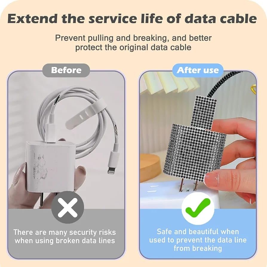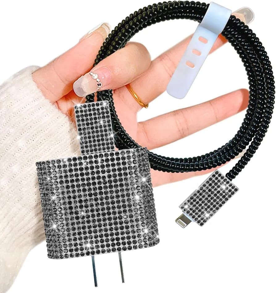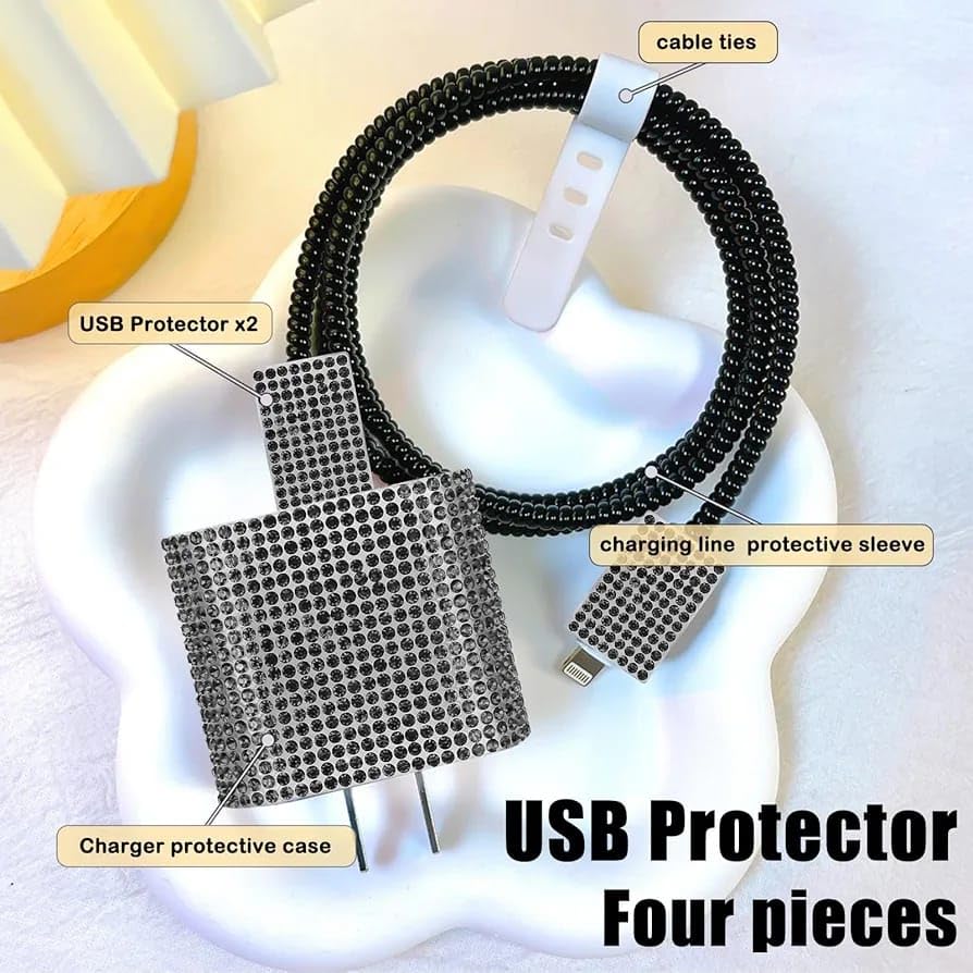 Generic - Decorative USB Charger & Cable Protector Set (4 Pieces) — Stylish Rhinestone Design for Women, Anti-Bending Cable Sleeve with Adapter Cover, Compatible with iPhone 20W Type-C Chargers (black)