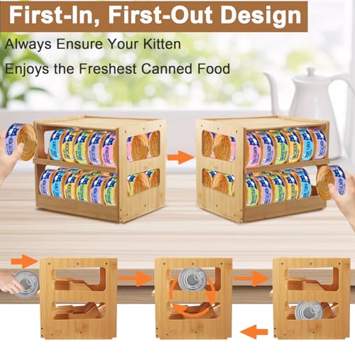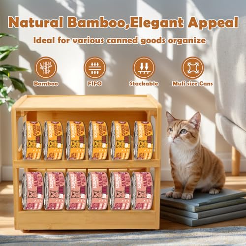 - Two-Tiered, Space-Saving Wonder: The cat food holder have two-tier layout accommodates 3-ounce cans and stacks neatly. Our Bamboo can storage rack fits in your pantry, cupboard, cabinets, and shelves. Easily connect additional bamboo can organizers for more food storage. Stack them on top of one another or attach them side by side to expand your canned food storage