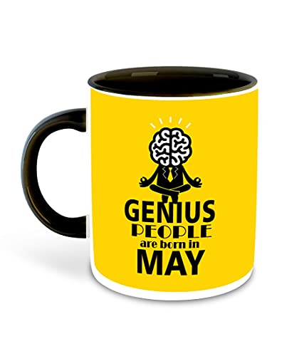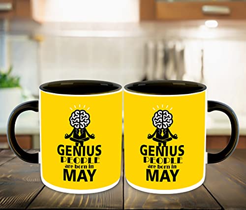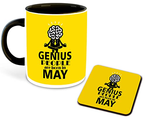 DecorVecor - مج للقهوة من السيراميك بلون اسود من الداخل مزين بطباعة عبارة Genius are Born in May مع قاعدة اكواب من ديكور فيكور، كوب شرب للحليب ملائم كهدية لتمني عيد ميلاد سعيد (مالتي 7)