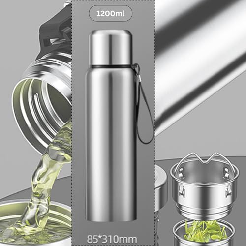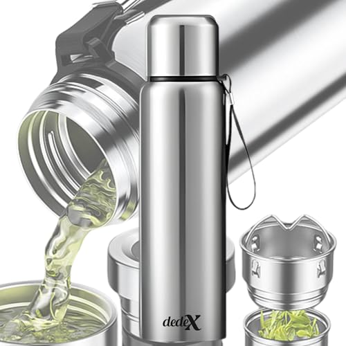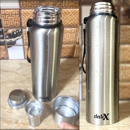 Dedex - زجاجة مياه من الفولاذ المقاوم للصدأ 304 بجدار مزدوج معزول حراريا بتقنية التفريغ الهوائي بفوهة واسعة مناسبة للسوائل الساخنة والباردة مع كوب ومصفاة من ديديكس - سعة 1.2 لتر