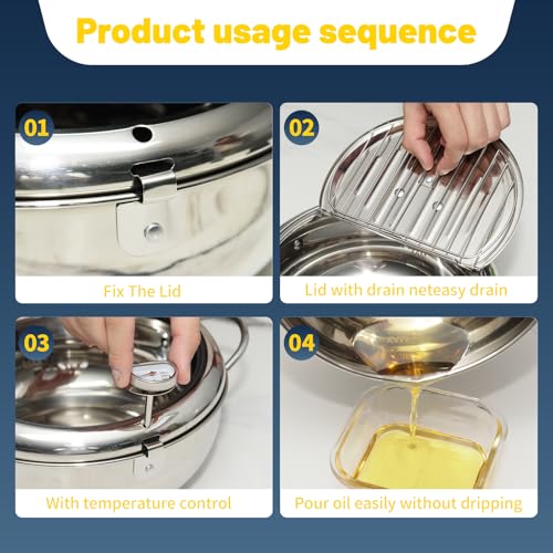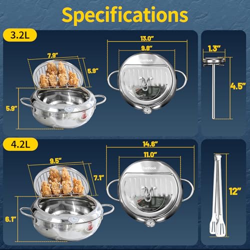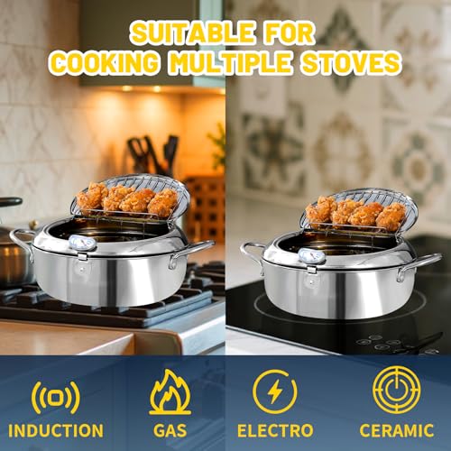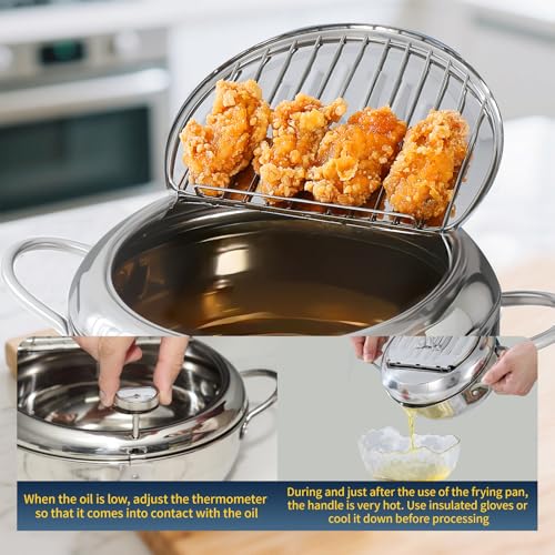 UrbanNook - Deep Fryer Pot(°F),304 Stainless Steel Pot for Fried chicken French Fries, Japanese Tempura Deep Frying Pan with Lid, Oil Fryer Pot with Thermometer,Freidora de Aceite,142 oz/4.2L