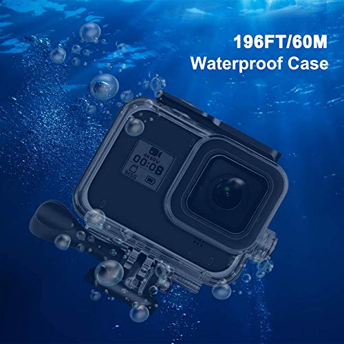 - 60M/196FT Waterproof Case + Silicone Case: Specially designed for GoPro Hero 8 Black action camera. This GoPro case waterproof up to 196ft/60M, with high transmittance to provide maximum clearness. Suits for extreme sport like surfing, diving, snorkeling, skiing, drifting, skydiving cycling, etc. Silicone Sleeve helps to prevent dent and daily light shocks.