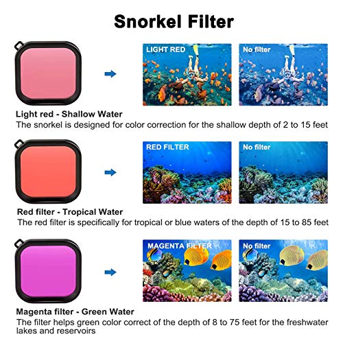 - Snorkel Filter: Three Different Kinds of Professional Color light red, red, magenta filter will provide outstanding color correction and improves contrast in various underwater video and photography conditions.