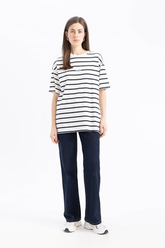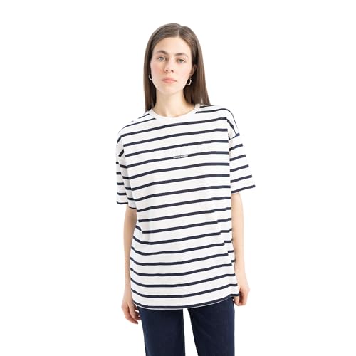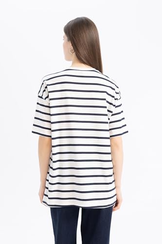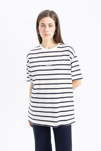 DeFacto - ديفاكتو تيشرت كاجوال منسوج باكمام قصيرة ورقبة دائرية ضيقة وقصة كبيرة للنساء E9017AX، كحلي، مقاس M