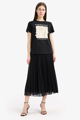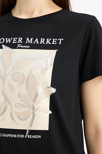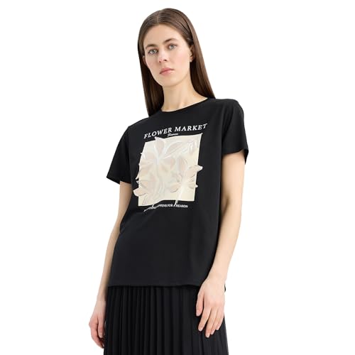 DeFacto - ديفاكتو تيشرت كاجوال منسوج باكمام قصيرة ورقبة دائرية ضيقة وقصة عادية للنساء F3070AX، اسود، مقاس XXL