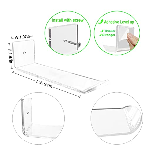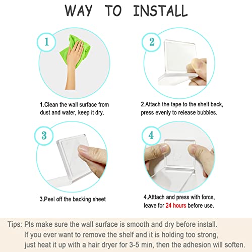 - 【NO DAMAGE TO THE WALL】Quickly install the acrylic wall shelf on the wall by using the adhesive wall stickers, you don't need to drill holes. Tips: Pls make sure the wall is smooth, clean before installing and it will stick better.
