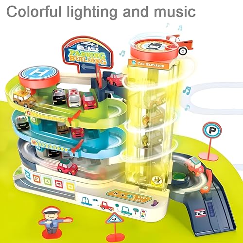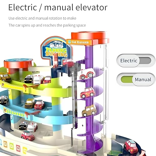 - Automatic mode brings the whole parking lot to life: press the ON switch and the built‑in speaker plays cheerful music, colorful traffic lights flash, and the motor‑powered elevator lifts the car. The vehicle then cruises automatically from the first floor up to the third floor and back, creating an endless loop powered by a single 3 A battery.