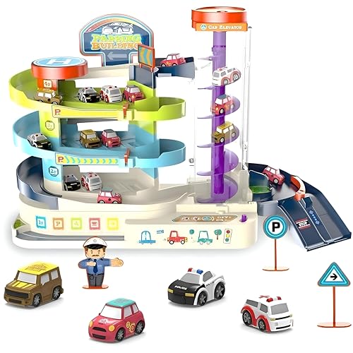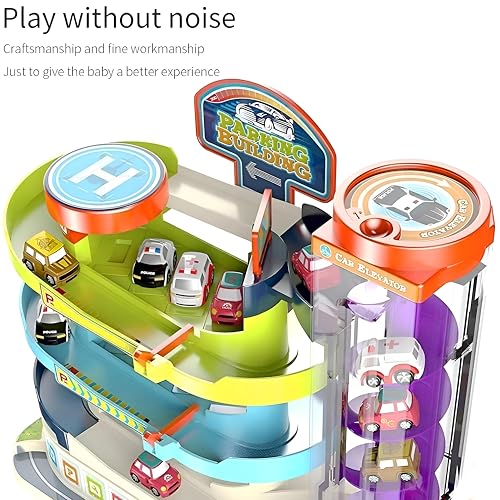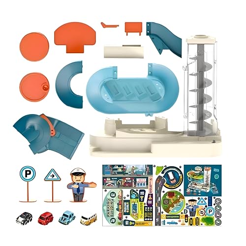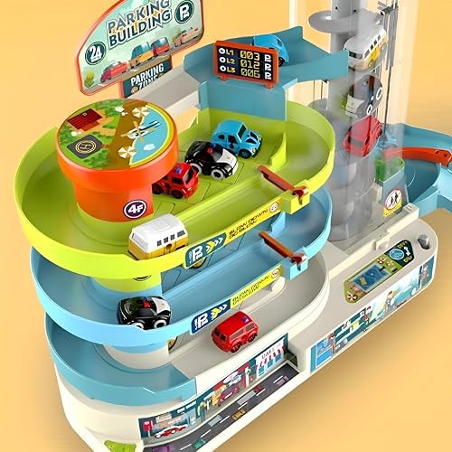 - The three‑level spinning track combines a parking garage, an airfield, road signs, a billboard and a rotating groove, offering a dynamic multi‑story racing environment. Cars can descend to the ground floor, exit the garage, and re‑enter, fostering spatial awareness and imaginative play.