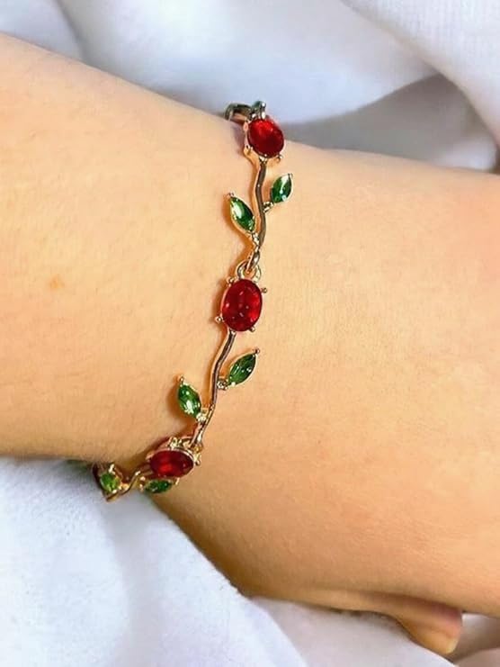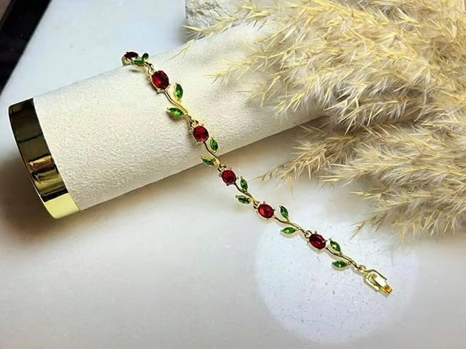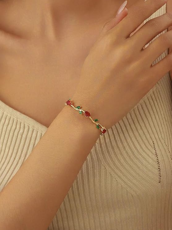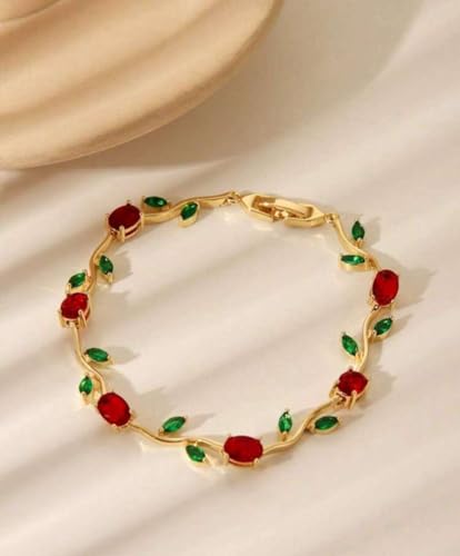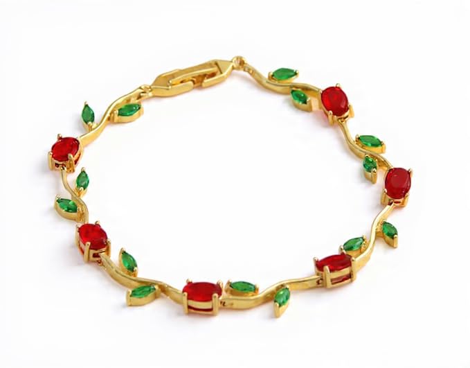 Generic - Dema 18K Gold Plated 316L Stainless Steel Flower Vine Bracelet for Women, Red and Green Cubic Zirconia Gemstone Charm, 7 Inch Dainty Elegant Jewellery Gift