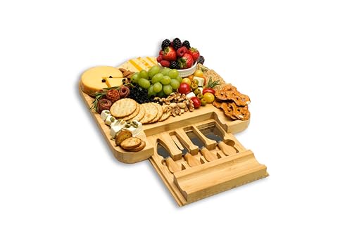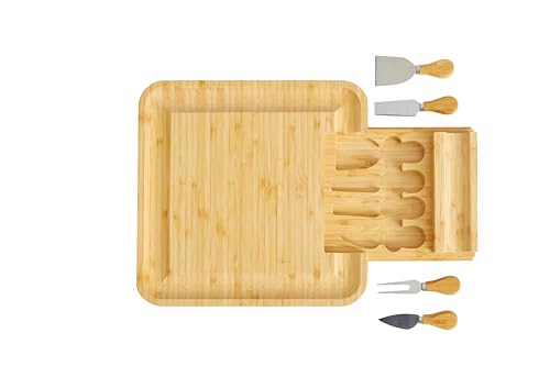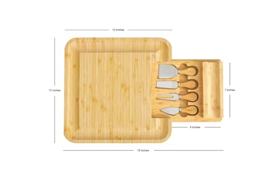 - Ultimate Entertainer: This versatile bamboo charcuterie board and cheese knife set comes complete with essential accessories: a premium knife set. The square design provides ample space for cheese, fruits, and more, ensuring seamless hosting from start to finish.