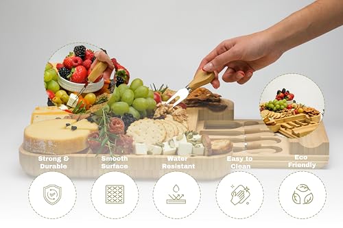 - Eco-Friendly Durability: Crafted from sustainable bamboo, our cheeseboard is not only beautiful but also built to last. Naturally resistant to liquids, odors, and stains, this charcuterie board combines eco-friendliness with a durable design, making it a valuable addition to your kitchen for years to come.